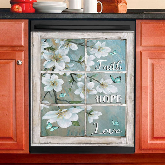 Faith Hope Love Window Flower White Dishwasher Cover, Christian Dishwasher Magnet Cover, Religious Kitchen Decor