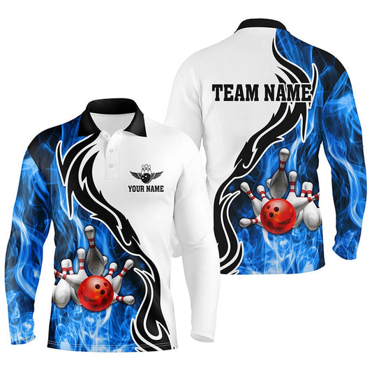 Custom Bowling Polo Shirts, Mens Bowling Shirts Custom Black Bowling Ball Flame Bowling Team Jerseys, Gift For Bowlers Blue