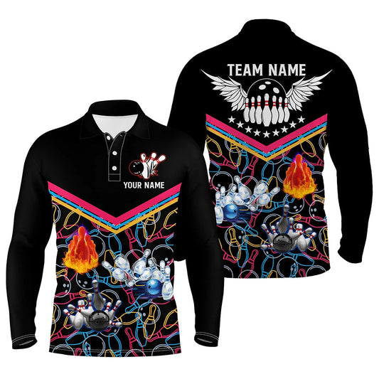 Custom Bowling Polo Shirts, Mens Polo Bowling Shirts Custom Rainbow Flame Bowling Ball And Pins Team League Bowler Jersey