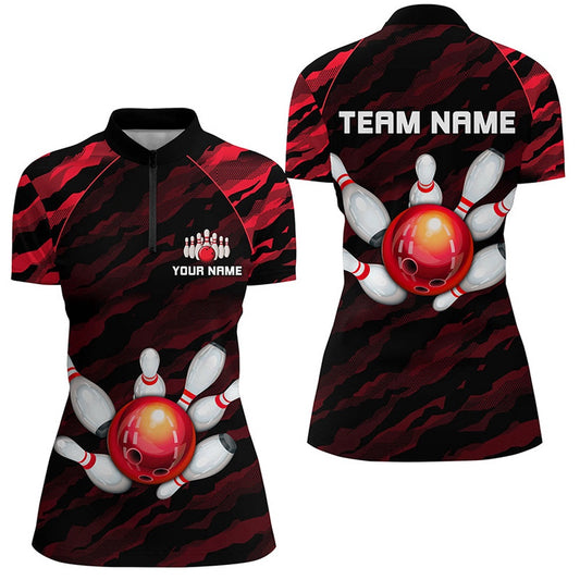 Custom Bowling Polo Shirts, Personalized Red Bowling Shirts Men Women Bowling Team Jersey Custom Bowling Zip Shirt