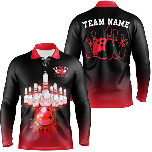 Custom Bowling Polo Shirts, Personalized Red Gradient Bowling Ball And Pins Team Jerseys, Mens Polo Bowling Shirts Bowling League