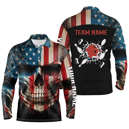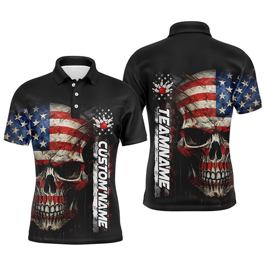 Custom Bowling Polo Shirts, Personalized Skull Bowling Shirt For Men Custom Team'S Name American Flag Bowler Jersey