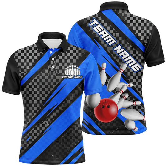 Custom Bowling Polo Shirts, Splatter Pins Custom Bowling Team Shirts For Men And Women, Bowling Tournament Shirt Blue