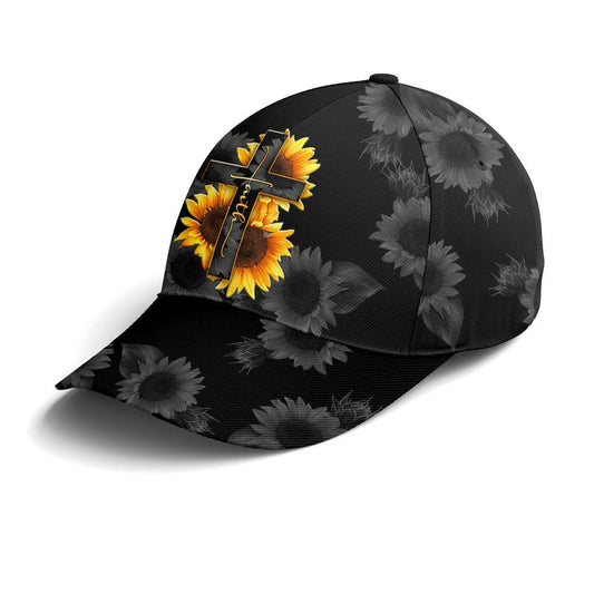 Sunflower Faith Floral Black All Over Print Baseball Cap, God Cap, Gift Ideas For Male