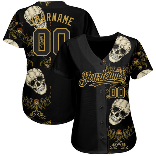 USA Baseball Jersey, Custom Black Old Gold 3D Plant And Skull Fashion Authentic Baseball Jersey, Team Jerseys Baseball