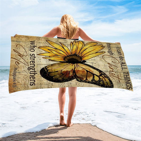 Butterfly Sunflower Pattern I Can Do All Things Through Christ Beach Towel, Christian Beach Towel, Christian Gift, Gift For Women