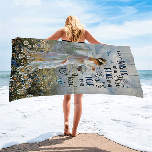 Daisy Field Blue Butterfly Beach Towel- I Want Daisies In My Hair Beach Towel - Christian Beach Towel - Bible Verse Beach Towel
