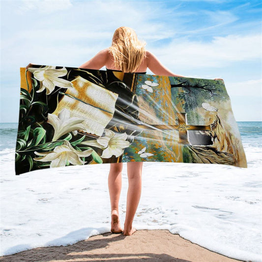 Bible Book Lily Flowers Golden Cross White Butterfly Beach Towel - Bible Verse Beach Towel - Inspirational Art - Christian Beach Towel
