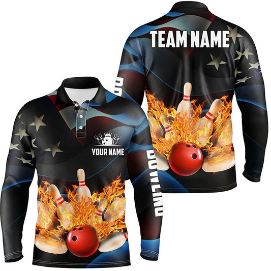 Custom Bowling Polo Shirts, American Flag Black Flame Bowling Polo Shirts For Men Custom Patriotic Bowling Team League Jerseys