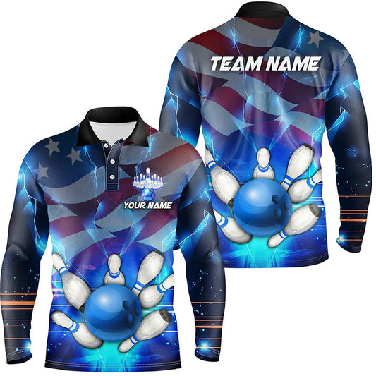 Custom Bowling Polo Shirts, American Flag Blue Custom Bowling Polo Shirts For Men Patriotic Bowling Team League Jerseys