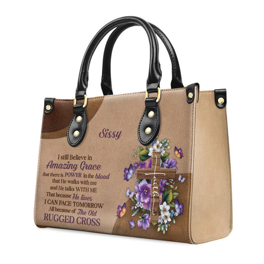 Personalized Christian Leather Bag, Stunning Personalized Floral Cross Leather Handbag - I Still Believe In Amazing Grace, Faith Handbag