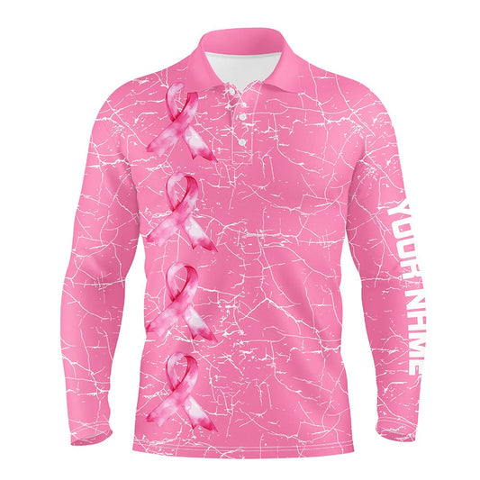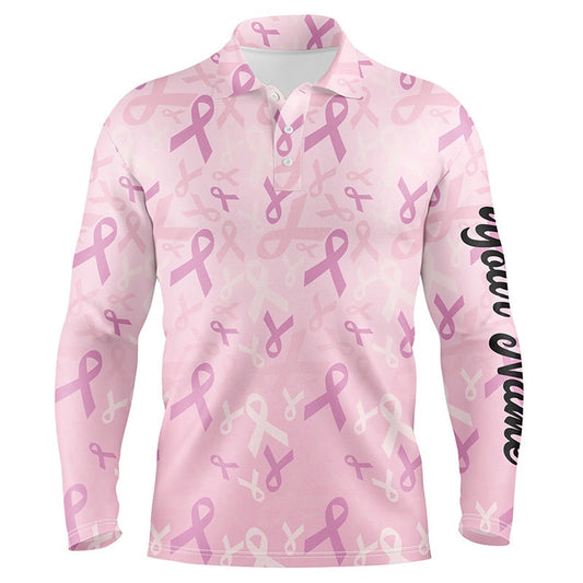 Golf Polo shirts, Pink Ribbon Pattern Breast Cancer Awareness Golf Shirts Custom Name Mens Golf Polo Shirts