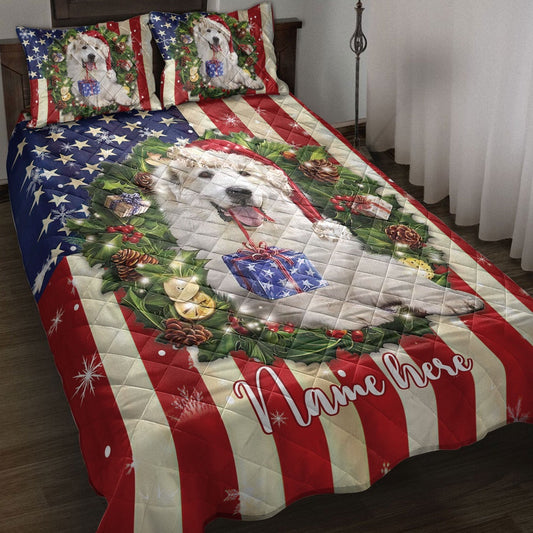 Personalized Great Pyrenees Quilt Set, Great Pyrenees Wearingmas Hat Wreath Quilt Blanket