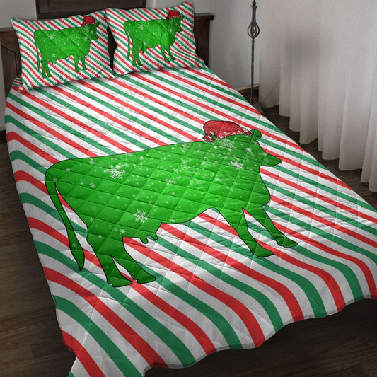 Cow Quilt Set, Cowmas Hat Cane Candy Stripes Shiny Green Winter Holiday Quilt Blanket
