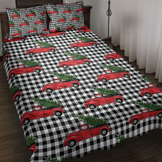 Christmas Quilt Set, Christmas Red Buffalo Plaid Truck Pine Trees Holiday Snowy Tree Quilt Blanket