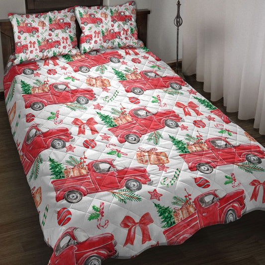 Christmas Quilt Set, Christmas Red Truck Candy Cane Snowflake Fir Tree Pine Tree Winter Quilt Blanket