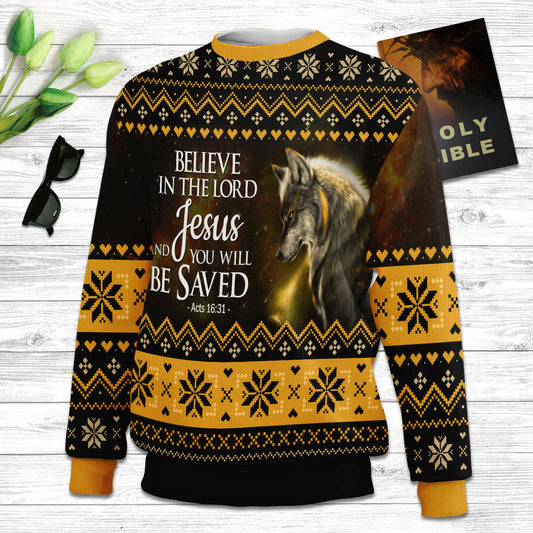 Believe In The Lord Jesus Wolf & Cross Ugly Christmas Sweater - Christian Unisex Sweater - Religious Christmas Gift