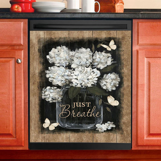 Flower White Butterfly Vintage Painting, Just Breathe Dishwasher Magnet Cover, Christian Kitchen Decor