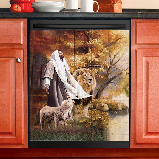 Animal Of God Stunning Lion White Lamb Autumn Forest Dishwasher Cover, Christian Dishwasher Magnet Cover