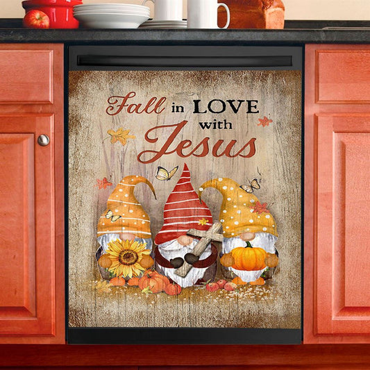 Autumn Gnome Wooden Cross Sunflower Butterfly Dishwasher Cover, Fall In Love With Jesus Dishwasher Magnet Cover, Christian Kitchen Decor
