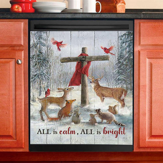 All Is Calm All Is Bright Animal Wooden Cross Dishwasher Cover, Christian Dishwasher Magnet Cover, Bible Verse Kitchen Decor