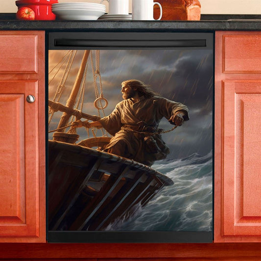 Power Jesus Christ Came To Rescue A Fishing Boat In A Storm Dishwasher Cover, Jesus Dishwasher Wrap, Christian Kitchen Decoration