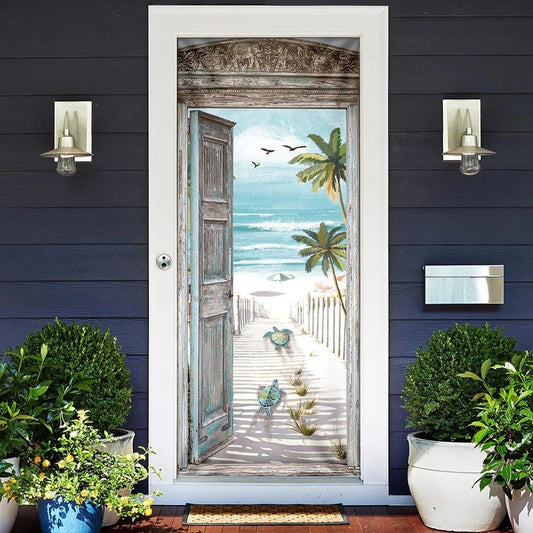 Turtle Beach Scene Door Cover, Unique Gifts Doorcover, Christmas Door Knob Covers, Christmas Outdoor Decoration