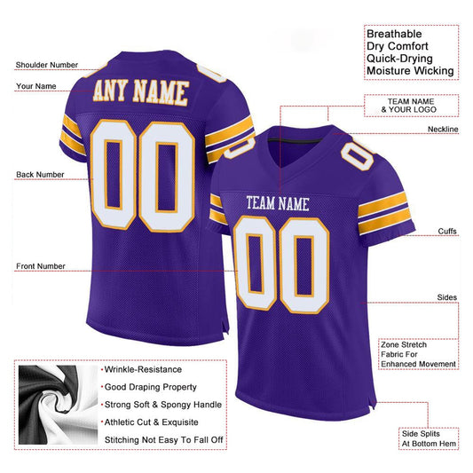 Custom Purple White Gold Mesh Authentic Football Jersey, Team Jerseys Football, Custom Football Jersey