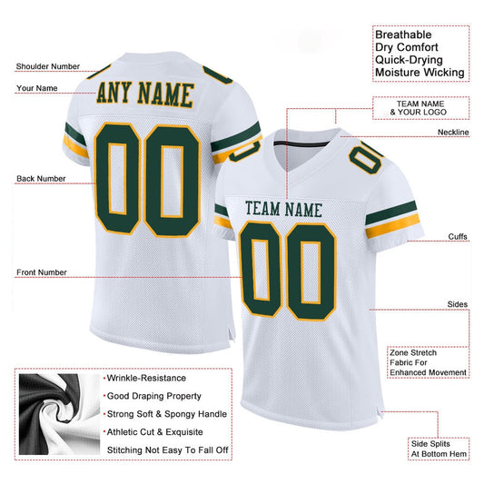 Custom White Green Gold Mesh Authentic Football Jersey, Team Jerseys Football, Custom Football Jersey