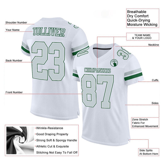 Custom White Silver Green Mesh Authentic Football Jersey, Team Jerseys Football, Custom Football Jersey