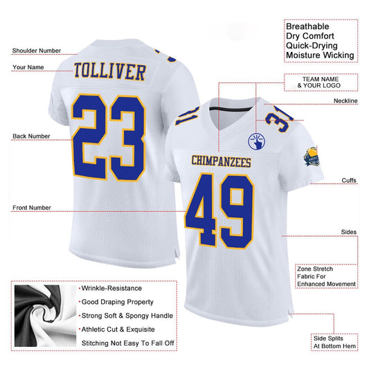 Custom White Royal Gold Mesh Authentic Football Jersey, Team Jerseys Football, Custom Football Jersey