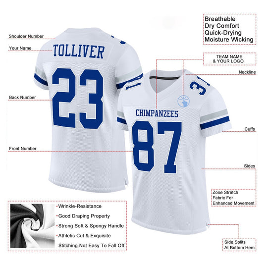 Custom White Royal Silver Mesh Authentic Football Jersey, Team Jerseys Football, Custom Football Jersey