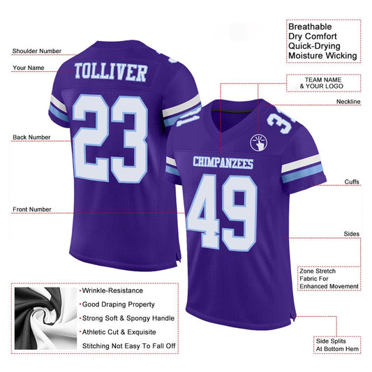 Custom Purple White Light Blue Mesh Authentic Football Jersey, Team Jerseys Football, Custom Football Jersey