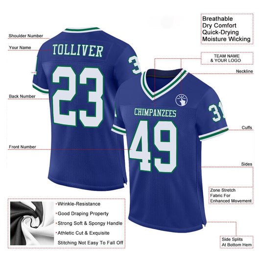 Custom Royal White Kelly Green Mesh Authentic Throwback Football Jersey, Team Jerseys Football, Custom Football Jersey