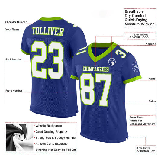Custom Royal White Neon Green Mesh Authentic Football Jersey, Team Jerseys Football, Custom Football Jersey