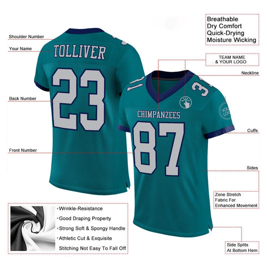 Custom Teal Gray Navy Mesh Authentic Football Jersey, Team Jerseys Football, Custom Football Jersey