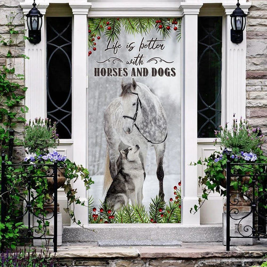 Life Is Better With Horses And Dogs Door Cover, Christmas Door Cover, Christmas Garage Door Covers, Christmas Outdoor Decoration