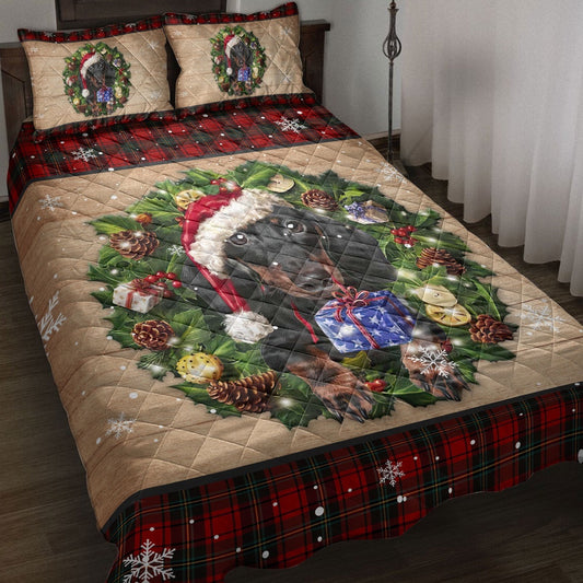 Dachshund Quilt Set, Dachshund Dog Wearing Wreath Amas Hat Buffalo Plaid Quilt Blanket