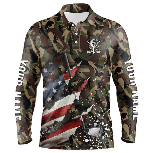 Golf Polo Shirts, American Flag Golf Clubs Camo Mens Golf Polo Shirts Custom Patriotic Golf Apparel For Men, Custom Golf Shirts