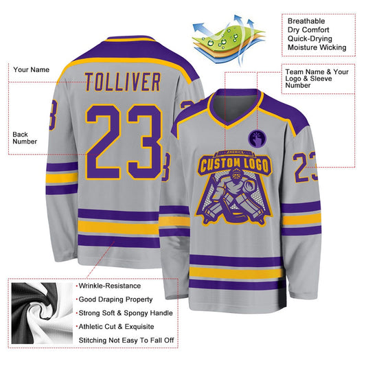 Usa Hockey Jersey, Custom Gray Purple Gold Hockey Jersey, Team Hockey Jerseys