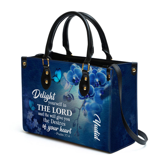 Delight Yourself In The Lord Psalm 37 4 Blue Orchids And Lilac Leather Bag, Personalized Leather Bible Handbag, Christian Gifts For Women