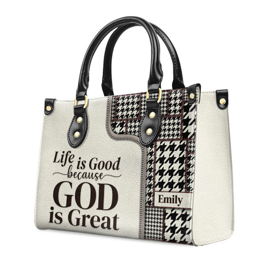 Personalized Christian Leather Bag, Life Is Good Because God Is Great - Black And White Christian Leather Handbag, Faith Handbag