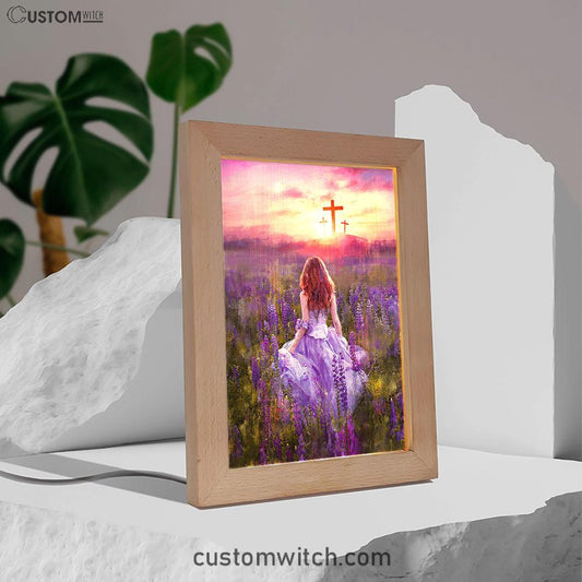 Beautiful Girl In The Lavender Field Cross Frame Lamp Art - Christian Night Light - Bible Verse Wooden Lamp