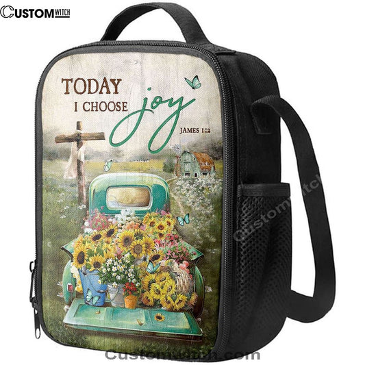 Today I Choose Joy Lunch Bag For Men And Women - Sunflower Car Flower Field Wooden Cross Lunch Bag, Spiritual Christian Lunch Box For School, Work