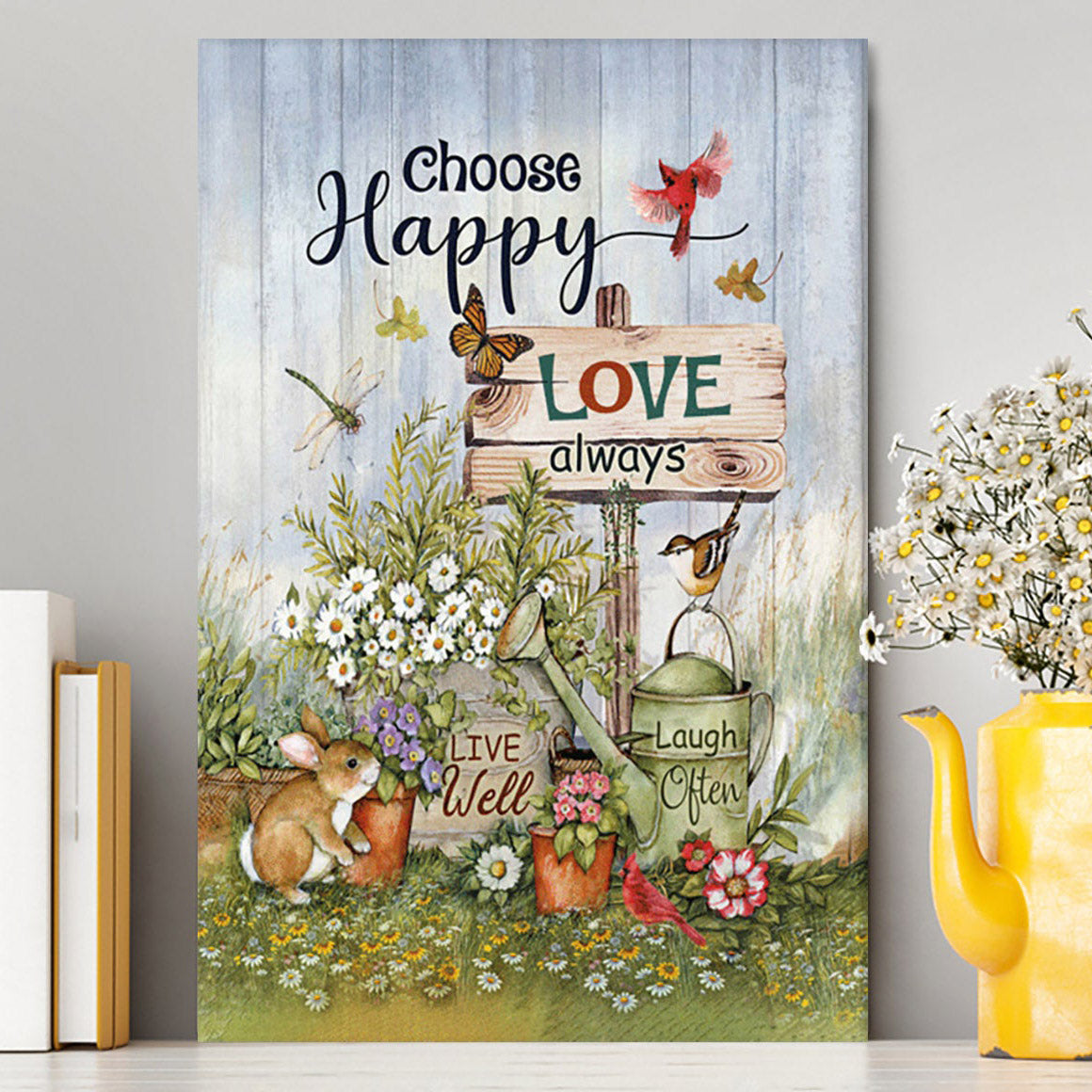 Garden Cute Rabbit Daisy Vase Canvas- Choose Happy Love Always Canvas Wall Art - Christian Canvas Prints