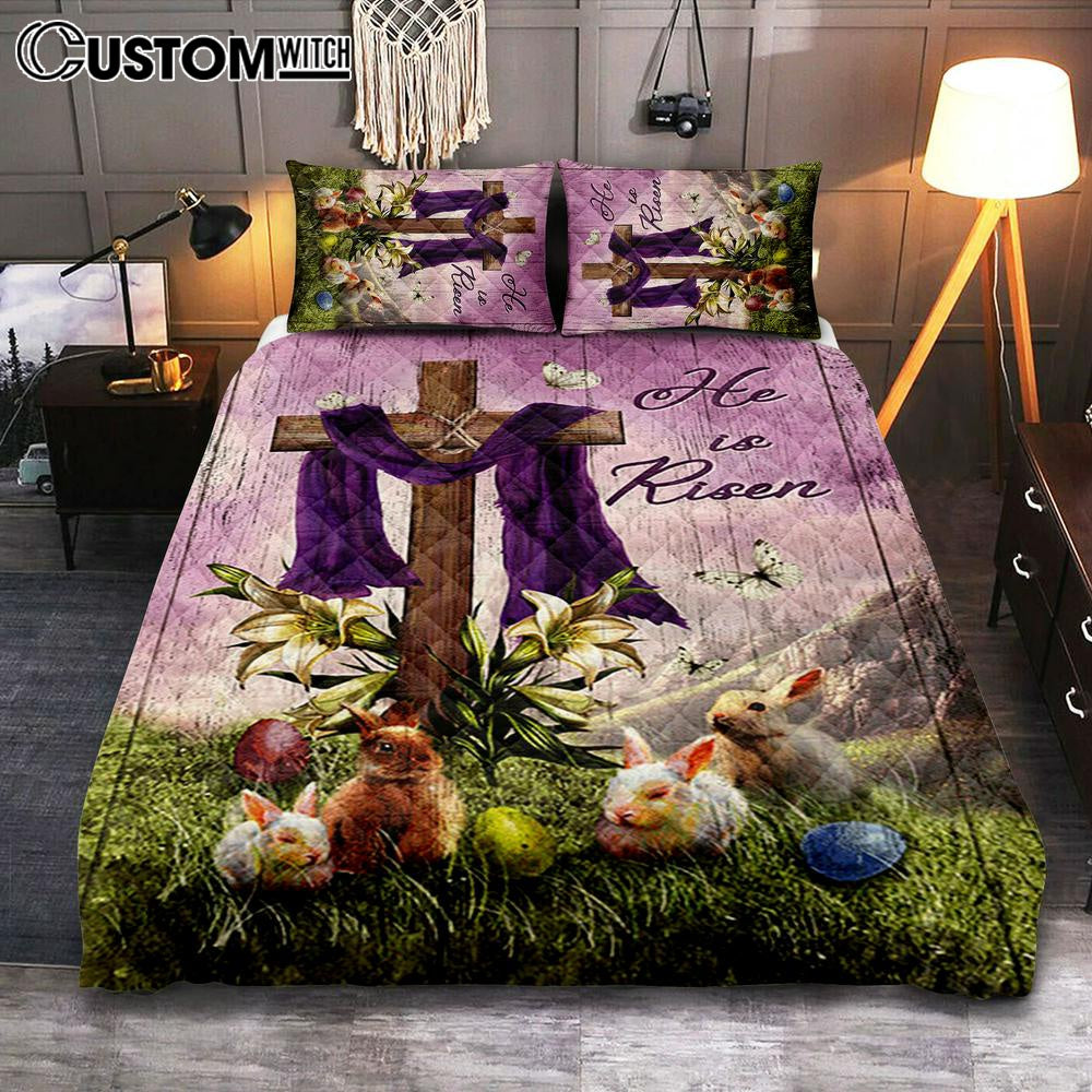 He Is Risen Easter Bunny Cross Lily Flower White Butterfly Purple Silk Quilt Bedding Set Art - Bible Verse Bedroom - Customwitch If you are looking for a bedding set that will elevate your bedroom's aesthetic and transform it into a peaceful sanctuary, then the Bedding Set is the perfect choice for you. Combining quality, elegance, and comfort, this bedding set is sure to help you get a good night's sleep.